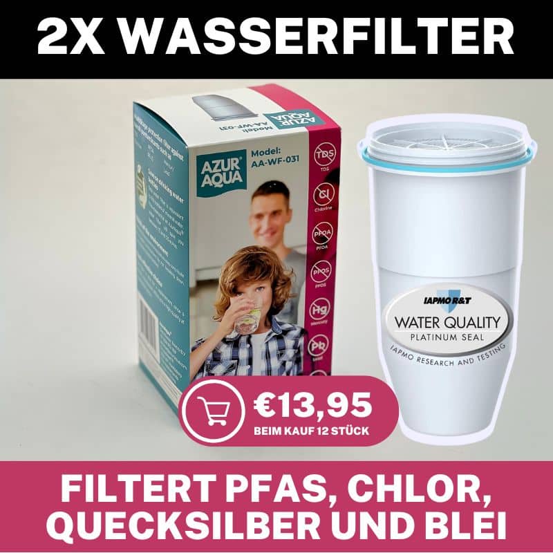 Filtern Sie PFAS, Chlor, Blei und Quecksilber aus Ihrem Trinkwasser mit dem AzurAqua Wasserfilter. Reduzieren Sie effektiv die Gesamtmenge gelöster Feststoffe (TDS) in Ihrem Leitungswasser von durchschnittlich 260 auf 0 und gewährleisten Sie so die Sicherheit Ihres Trinkwassers.