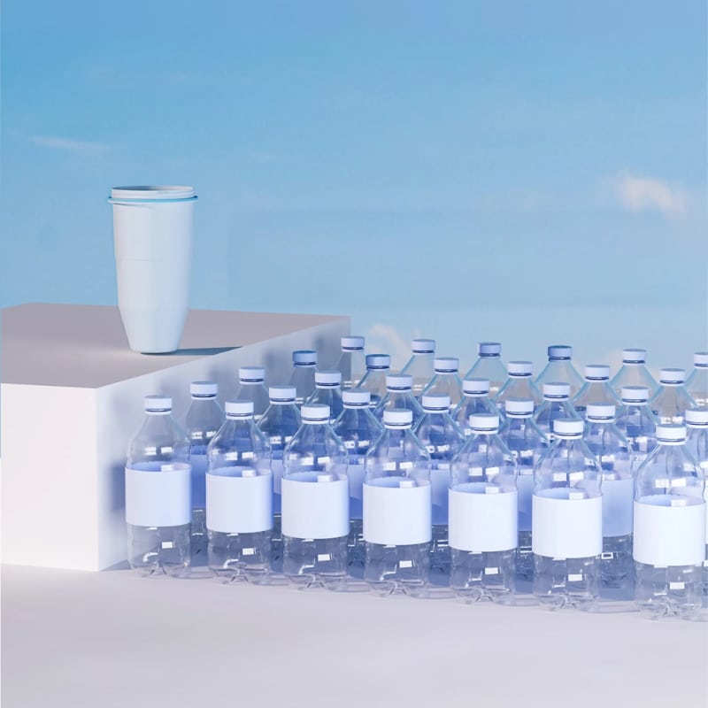 Denk aan het milieu Je bespaart niet alleen op je portemonnee, maar je draagt ook nog eens bij aan een beter milieu door geen onnodige plastic flessen af te breken!