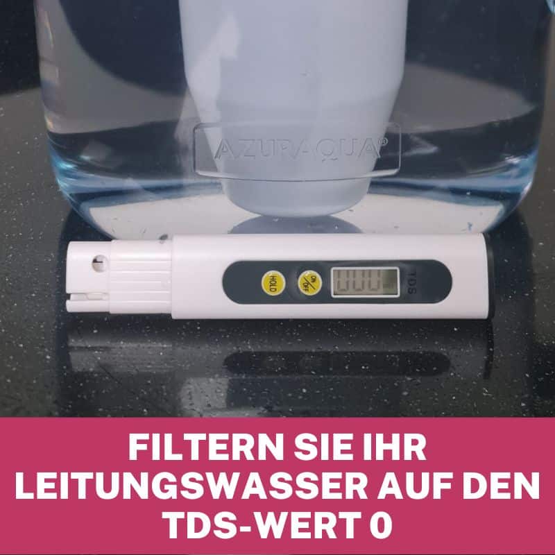 Filtern Sie PFAS, Chlor, Blei und Quecksilber aus Ihrem Trinkwasser mit dem AzurAqua Wasserfilter. Reduzieren Sie effektiv die Gesamtmenge gelöster Feststoffe (TDS) in Ihrem Leitungswasser von durchschnittlich 260 auf 0 und gewährleisten Sie so die Sicherheit Ihres Trinkwassers.