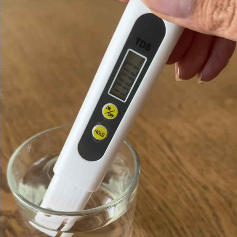 De TDS-meter meet de hoeveelheid opgeloste stoffen (Total Dissolved Solids) in jouw kraanwater, zoals een thermometer de temperatuur meet. Een hogere TDS-waarde duidt op meer vervuiling in het water. Het geeft echter geen informatie over of de stoffen schadelijk zijn of gezond.